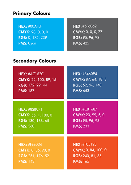 Our primary colours are used in the logo as well as various design devices and background colours. Cyan Blue provides an airy, modern tone. It relates to blue skies and open seas, opportunity and progress. It is a classic colour that won’t feel trendy.