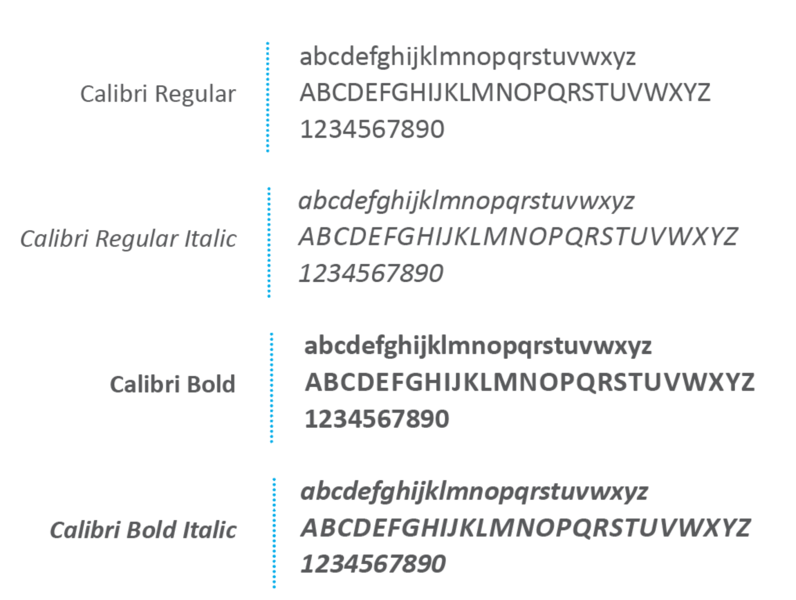 Though usually subconscious, our consistent use of fonts is an immediate identifier of our brand. It's easy, so let's use Calibri. It's is available on virtually every computer, and it easily translates from print to electronic materials.